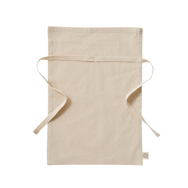 巾着紐をリボンとして結べるようにしたオーガニックコットン素材のラッピング巾着です。商品を入れて紐を結ぶと袋口が花のような形にすぼまり、簡単に可愛らしくラッピングできます。ボトルやタオル等を入れるのに丁度よいサイズで、SDGs関連の商品パッケージや店頭ギフトラッピング資材としてオススメのアイテムです。正面にはシルク印刷または転写印刷でのプリントが可能。よりオリジナル性の高いグッズをお作りいただけます。
