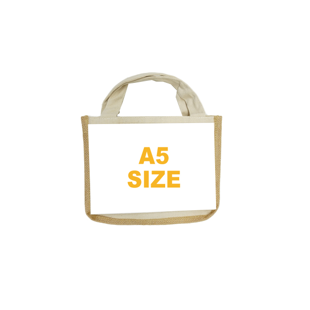 人気のジュートバッグとキャンバスとの異素材を合わせた新しいバッグが登場しました。丸みを帯びた可愛らしい形状がデザインのポイントです。ジュート素材は目が粗く、細かな印刷には向きませんが、バッグの前面と背面にキャンバス素材を採用したことで、コットンのバッグと変わらないクオリティの印刷が可能となりました。全部で3サイズある中で一番小さいサイズになります。350mlのペットボトルやランチボックスを入れるのにぴったりのサイズ感です。食品のギフトバッグや、物販品等様々な用途でご活用いただけます。印刷はシルク印刷、熱転写印刷が対応可能なので、イラストやロゴ等、お好みのデザインを印刷してオリジナルのバッグが作成できます。