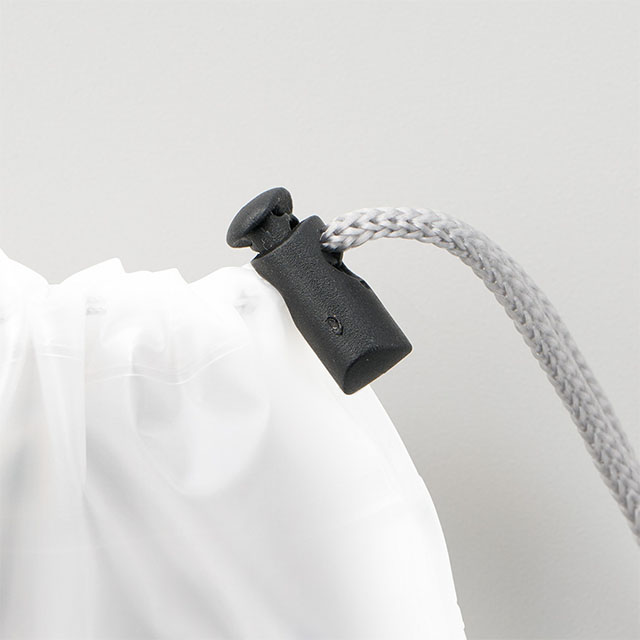 EVA素材の巾着です。EVAは水や紫外線に強く、耐久性と柔軟性があるため劣化しにくい特徴があります。また塩素を含まないので焼却時にダイオキシンが発生しない環境に優しい素材です。ストッパー付きで絞り口をしっかり閉じることができます。普段使いのほかレジャーやトラベルの際におすすめ。同じ商品で一回り大きいサイズもございます。