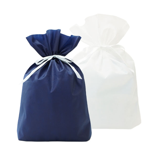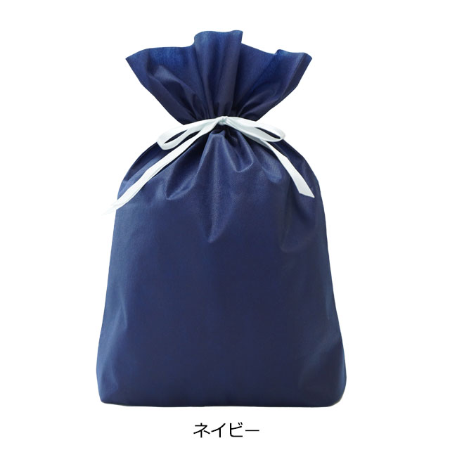 ギフトラッピングに最適な不織布素材のマチ付きラッピング袋です。上品なホワイトと落ち着いたネイビーの2色展開、サイズは大小の2種類をご用意しておりますので、用途に応じてお選びいただけます。こちらは大サイズで平置きの状態でA3サイズございます。商品を入れてサテンリボンを絞れば、袋口が花のような形にすぼまり、簡単に可愛らしくラッピングすることが可能です。マチ付きなのでしっかり収納でき、ぬいぐるみや衣類、箱入りギフトなどにおすすめの商品です。