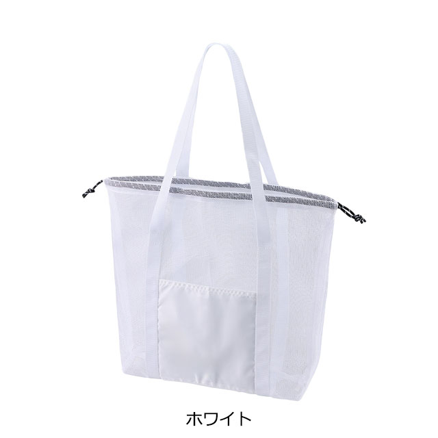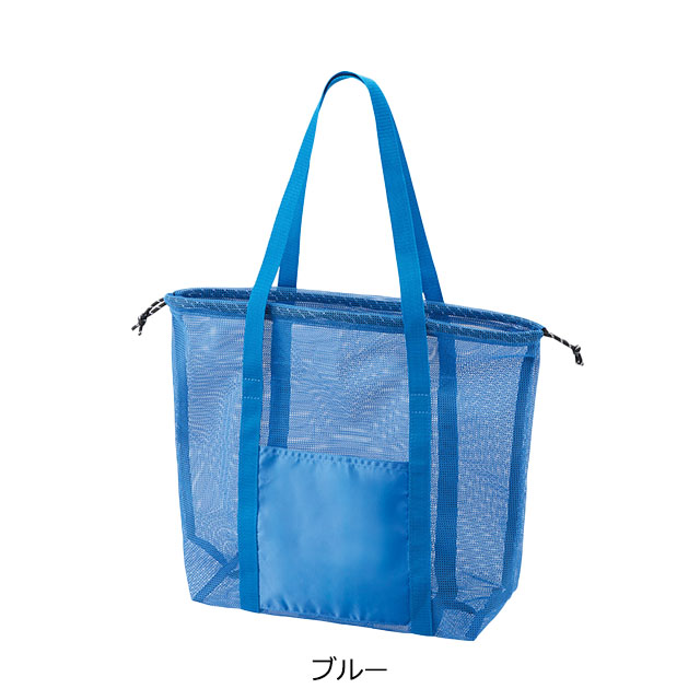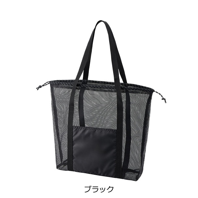 トレンドのメッシュ素材のトートバッグです。スポーツやレジャー、スパ、サウナなどにおすすめ。外ポケットが付いているのでスマホや小物を入れるのに便利です。3サイズ展開となっており、こちらはバスタオルや1Lボトルなどが入る大容量サイズです。口元が絞れる巾着タイプなので、中の荷物が飛び出さず安心です。