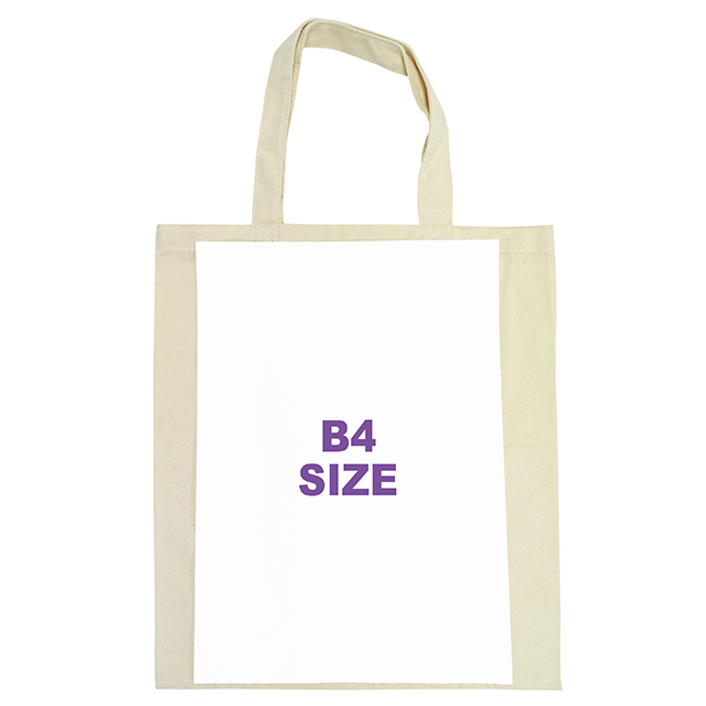 サイドに折りたたまれた状態のマチがあるやや厚手のコットンバッグです。肩掛け可能でB4サイズの書類が入ります。約10cmのマチにより荷物がたっぷり入ります。プリントが映えるシンプルなデザインで、物販用のアイテムやショップノベルティ、学校オリジナルバッグなど、様々なアイテムに活用できます。同サイズで無漂白のナチュラルカラー(エコマーク付き)もございます。