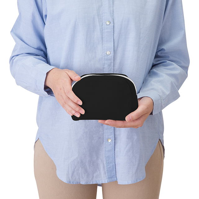 マチが広くころんとした形状のキャンバス地ポーチです。化粧道具やステーショナリー、モバイルアイテムなど小物をまとめて収納できます。マチが大きめなので、ハンドクリームやリキッドファンデーションのようなかさばるアイテムもしっかり入ります。ブラック・ネイビーの他にナチュラルがあり、全3色展開です。また、もう一回り大きいサイズのNo.2もあります。