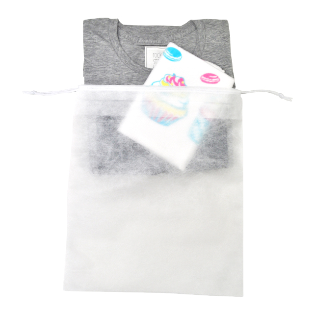 透ける不織布素材のマチなし巾着です。A4対応サイズですので、Tシャツや帽子といった商品の内袋として、また保管袋としても最適です。白と黒のベーシックな2色展開、商品に合わせて5サイズからお選びいただけます。