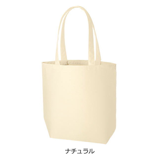 中身が透けず、かつ厚すぎないので畳みやすい8オンスコットンを使った、ライトキャンバスのトートバッグです。こちらは全3サイズある中の一番大きいサイズで、B4サイズ対応です。マチが広めで荷物がたっぷり入り、また持ち手は肩掛けできる長さで、テキストや資料を入れるのに便利です。シンプルなデザインでプリント内容次第で雰囲気が変わりますので、展示会やイベントの資料入れとして、また通勤・通学のサブバッグとして活躍します。ナチュラルカラーは無漂白で、地球にやさしいエコマーク商品となっています。同サイズで他にカラー展開もあります。