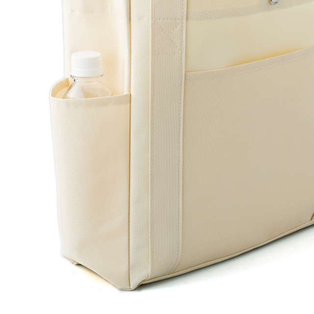 3つの外ポケットや口元のボタンなど、使い勝手の良い機能満載のトートバッグです。両サイドのポケットにはペットボトルや折り畳み傘が収納可能です。A4サイズ対応、開口部はボタン留めで中身の飛び出しを防ぎます。ポリエステル製のため、コットン生地と比較して汚れにくく撥水性が高いのも嬉しいポイント。通勤に通学に、大活躍間違いなしのオリジナルバッグが作れます。